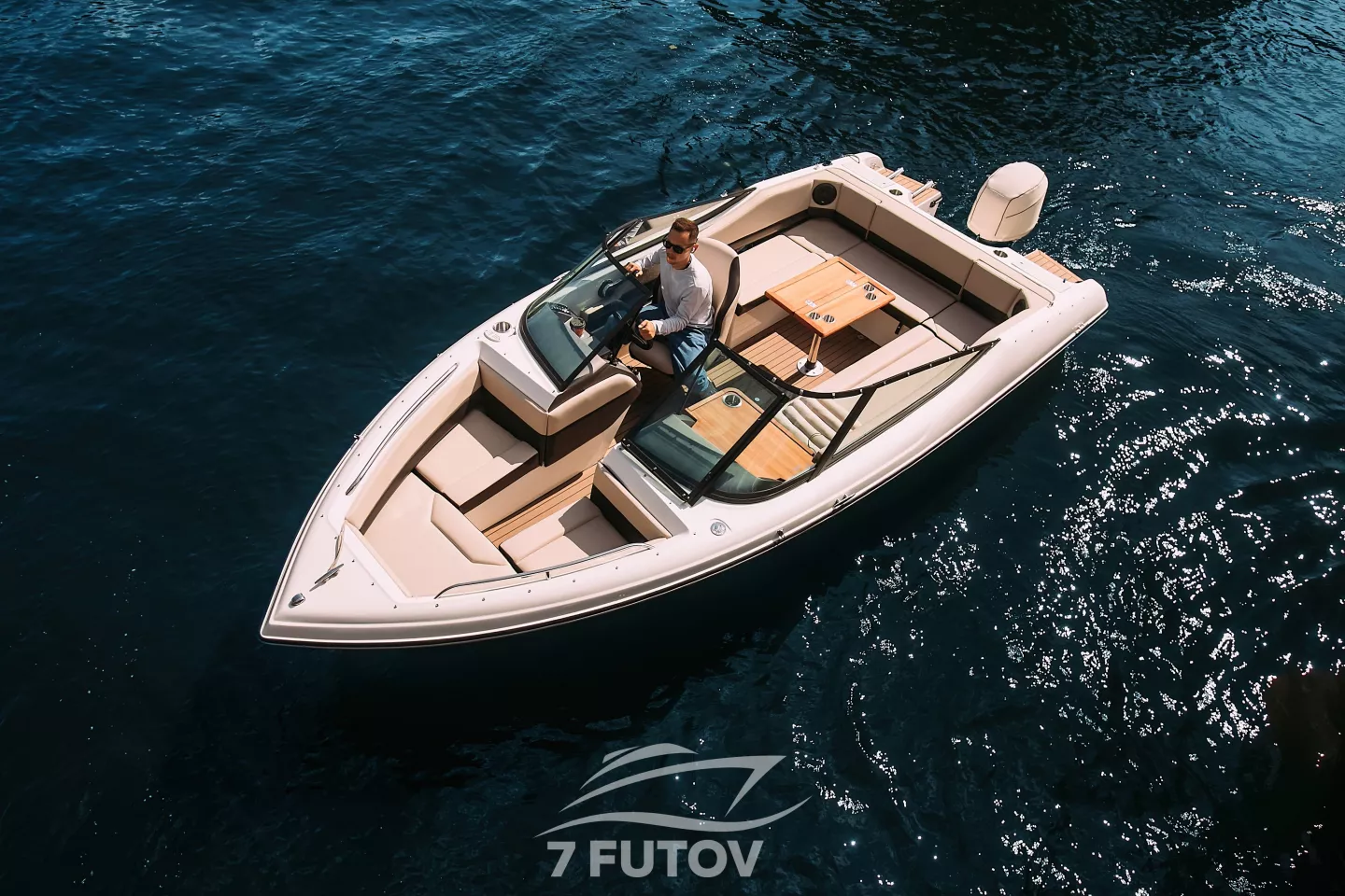 Компактный 6-метровый катер вмещает до 6 гостей 👥 и оснащён открытым носом, кожаными диванами и деревянным столом, создающими уютную атмосферу для отдыха на воде.